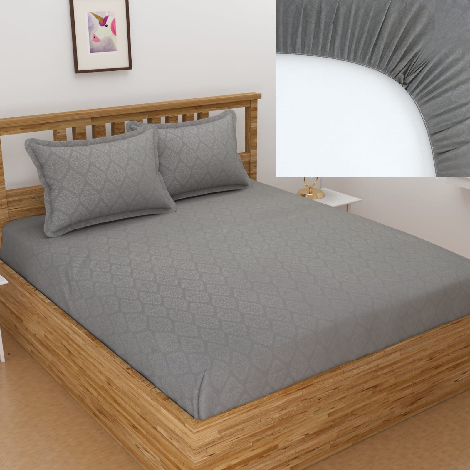 Grey Elastic Fitted Glace Cotton Plain Stripe Double Bedsheet with 2 Pillow Cover